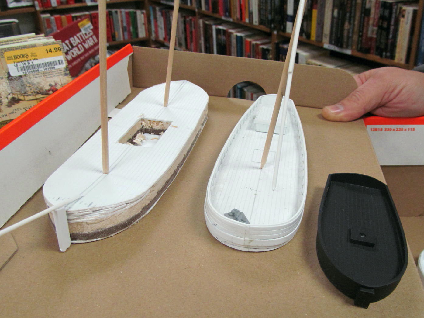 | Work in progress, the mortar boat (back), a gunboat (center), and one of my gunboats (for size comparison) in the foreground |