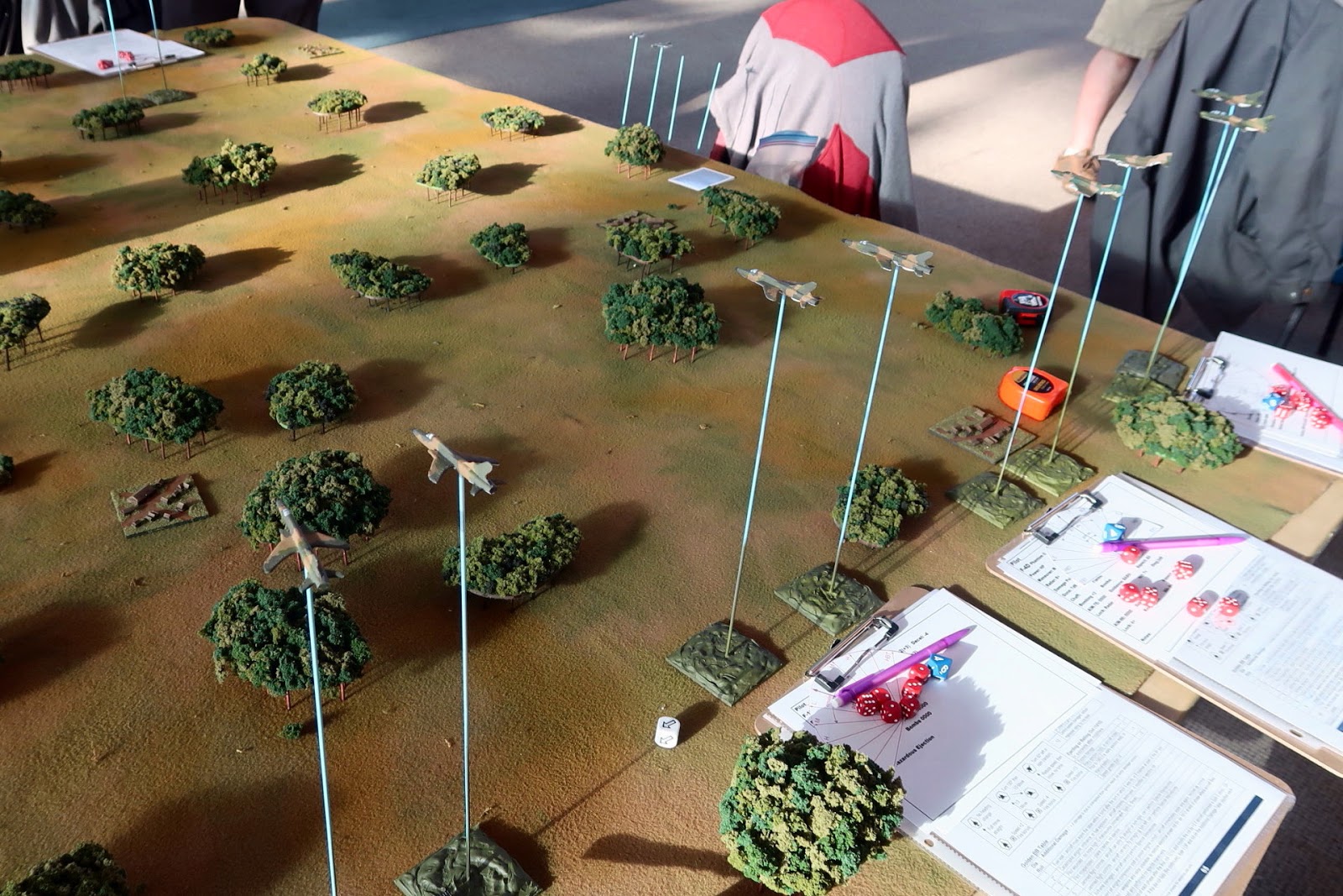 The morning session had an air attack on a bridge during the Vietnam War (using the AirWar C21 rules), a World War I - Wings of Glory game, a World War II Eastern Front microarmor game, and the air battle over Malta game Kevin and I ran.